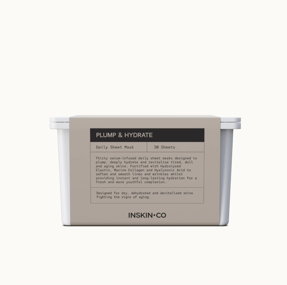 Thirty serum-infused sheet masks designed to plump, deeply hydrate, and revitalise tired, dull, and aging skins. These daily sheet masks are fortified with Hydrolysed Elastin, Marine Collagen and Hyaluronic Acid to soften and smooth lines and wrinkles whilst providing instant and long-lasting hydration resulting in a more youthful and fresher complexion. This product contains Marine Based Collagen and is not vegan friendly.