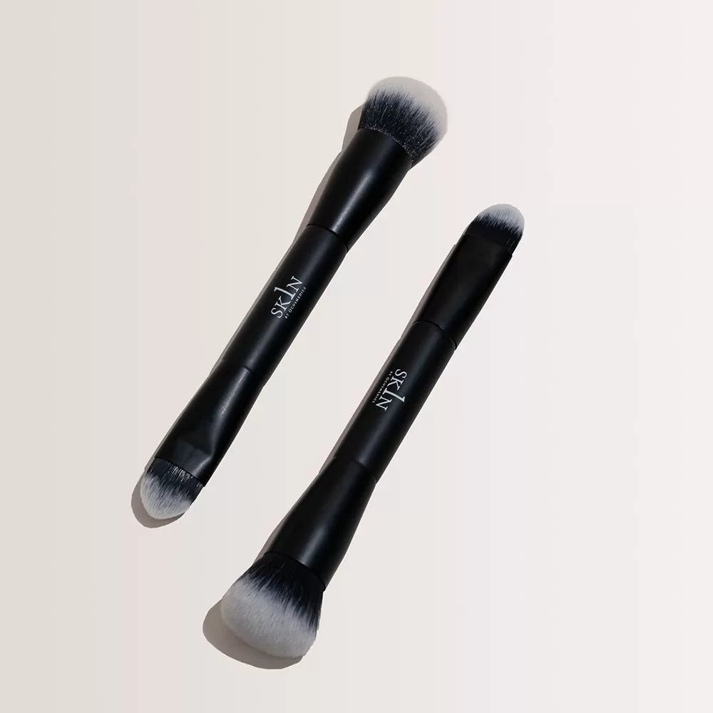 A bespoke brush with dual ends for targeted and diffused application. Flat and tapered on one end and full and fluffy on the other.